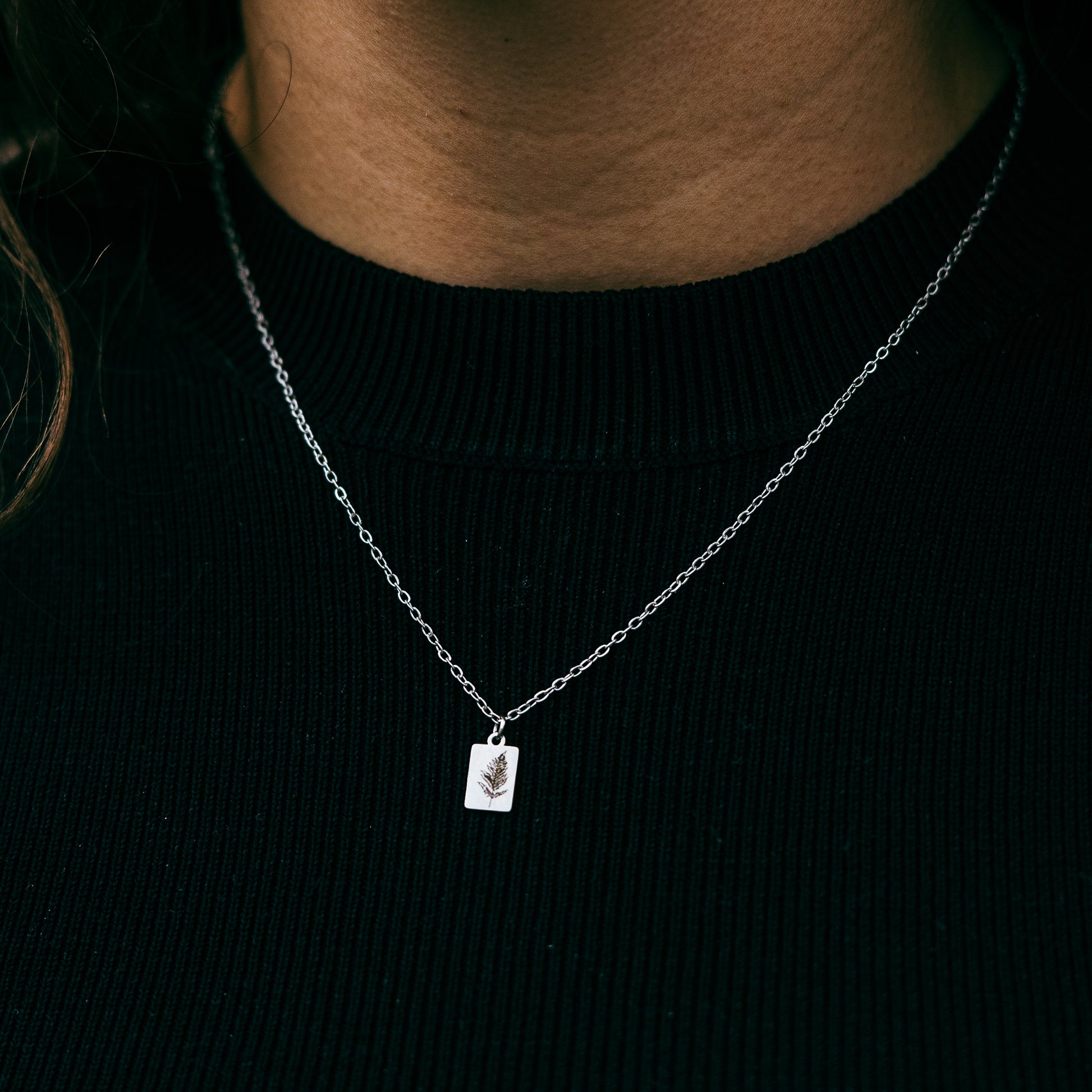 Fern leaf engraved on round pendant hanging on 45cm chain