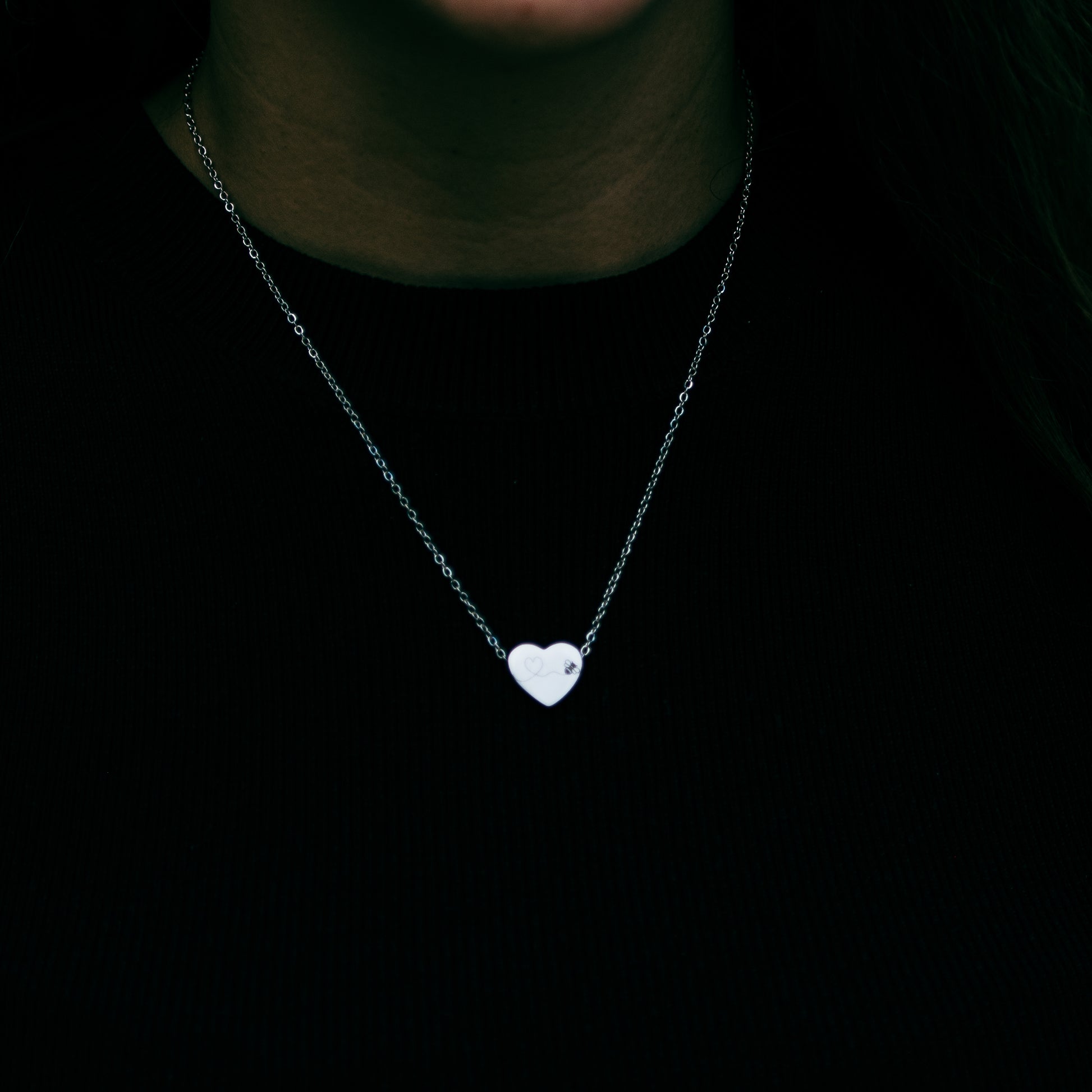 Bee flying in a heart engraved on heart pendant hanging on 45cm chain