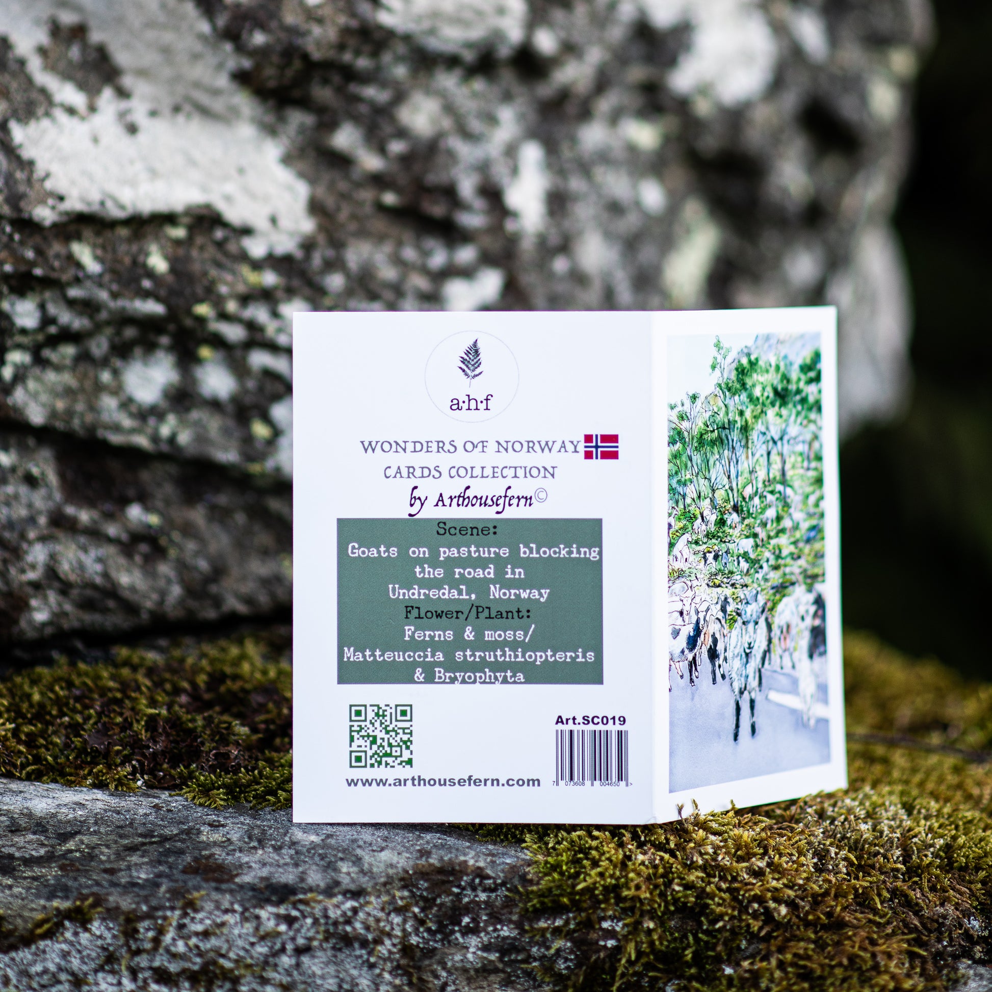 Scenery card- Goats in Undredal valley blocking the road with ferns