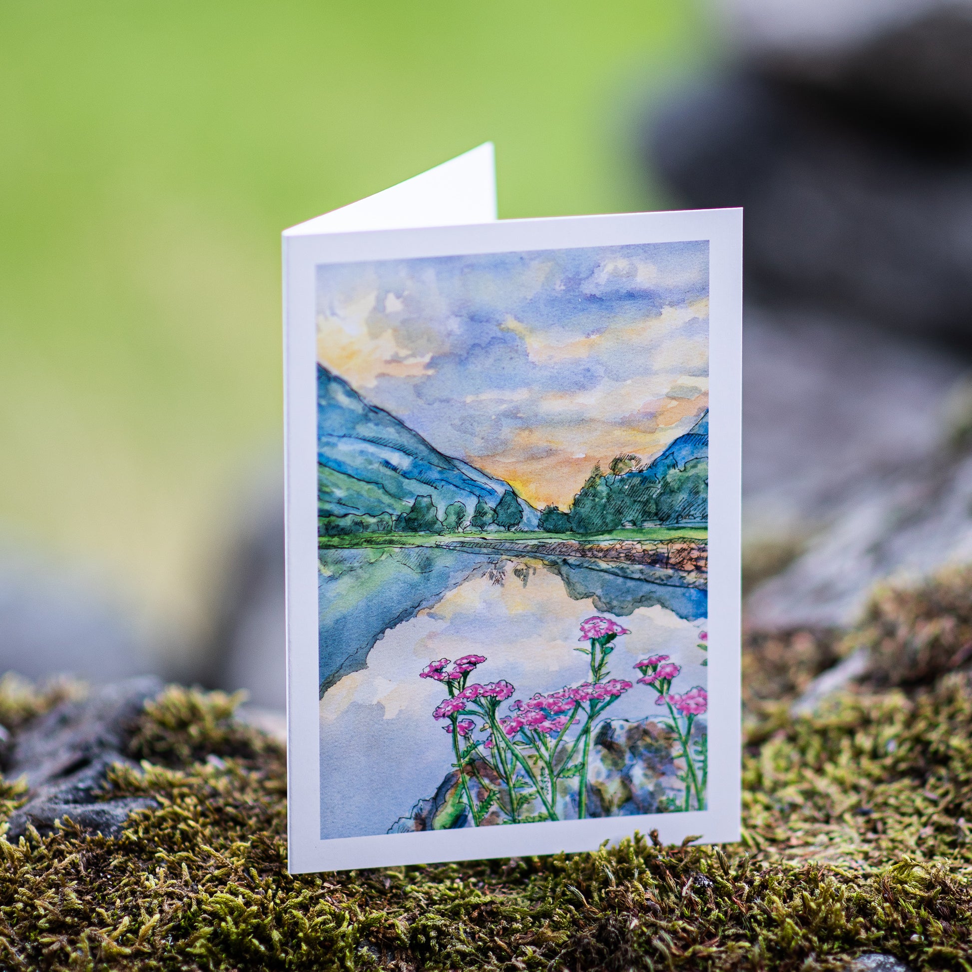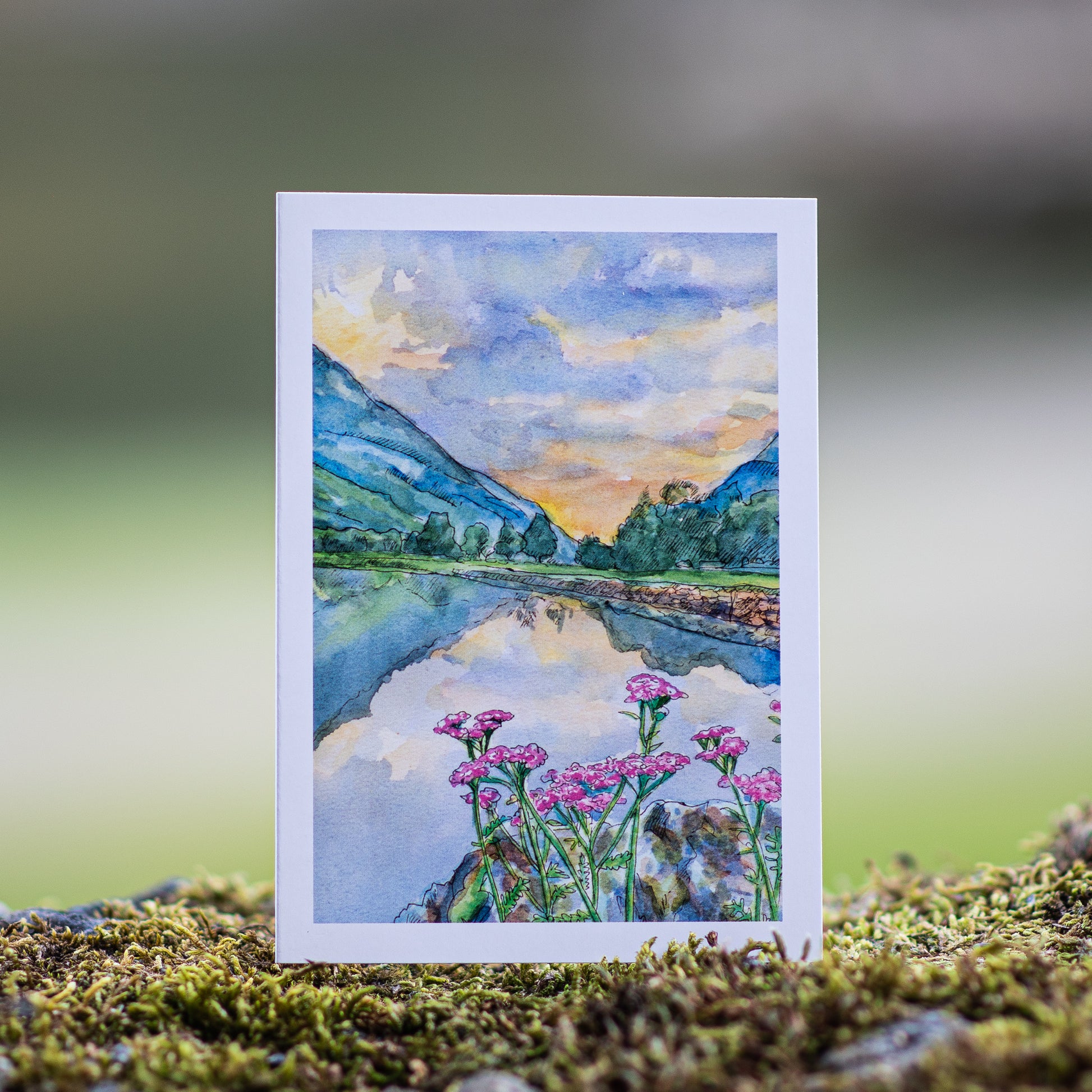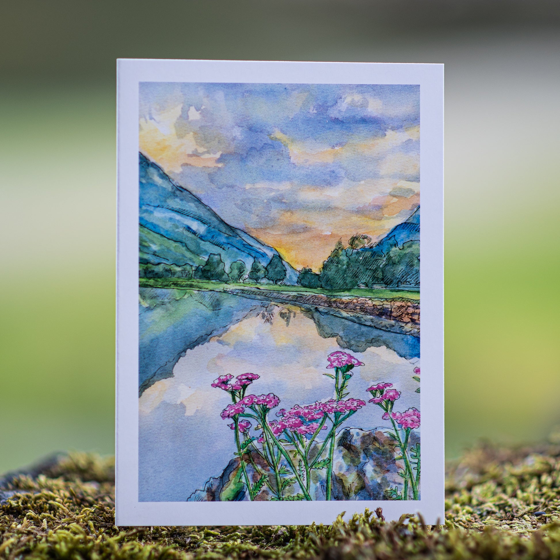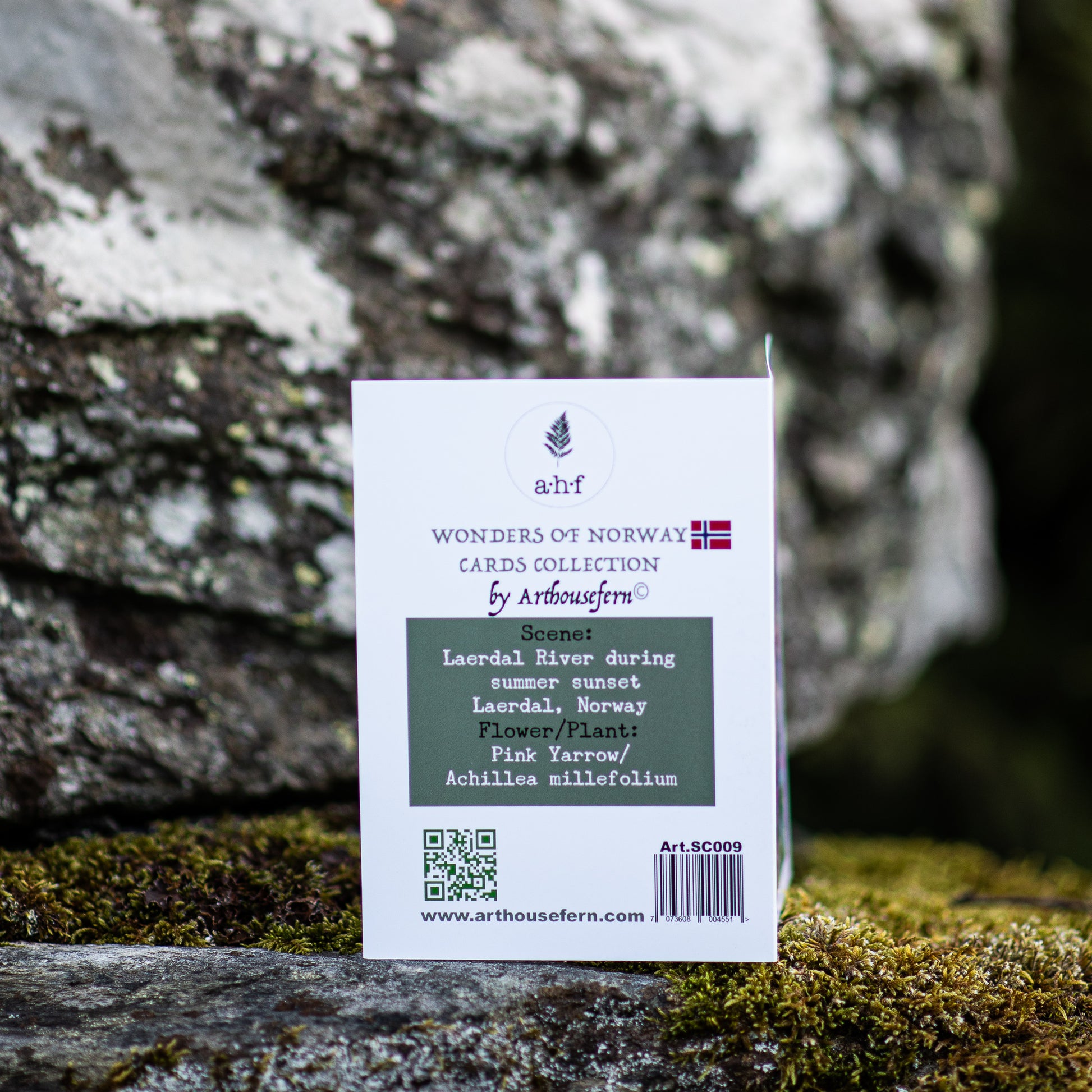 Scenery card- Lærdal River with Pink Yarrows during summer sunset